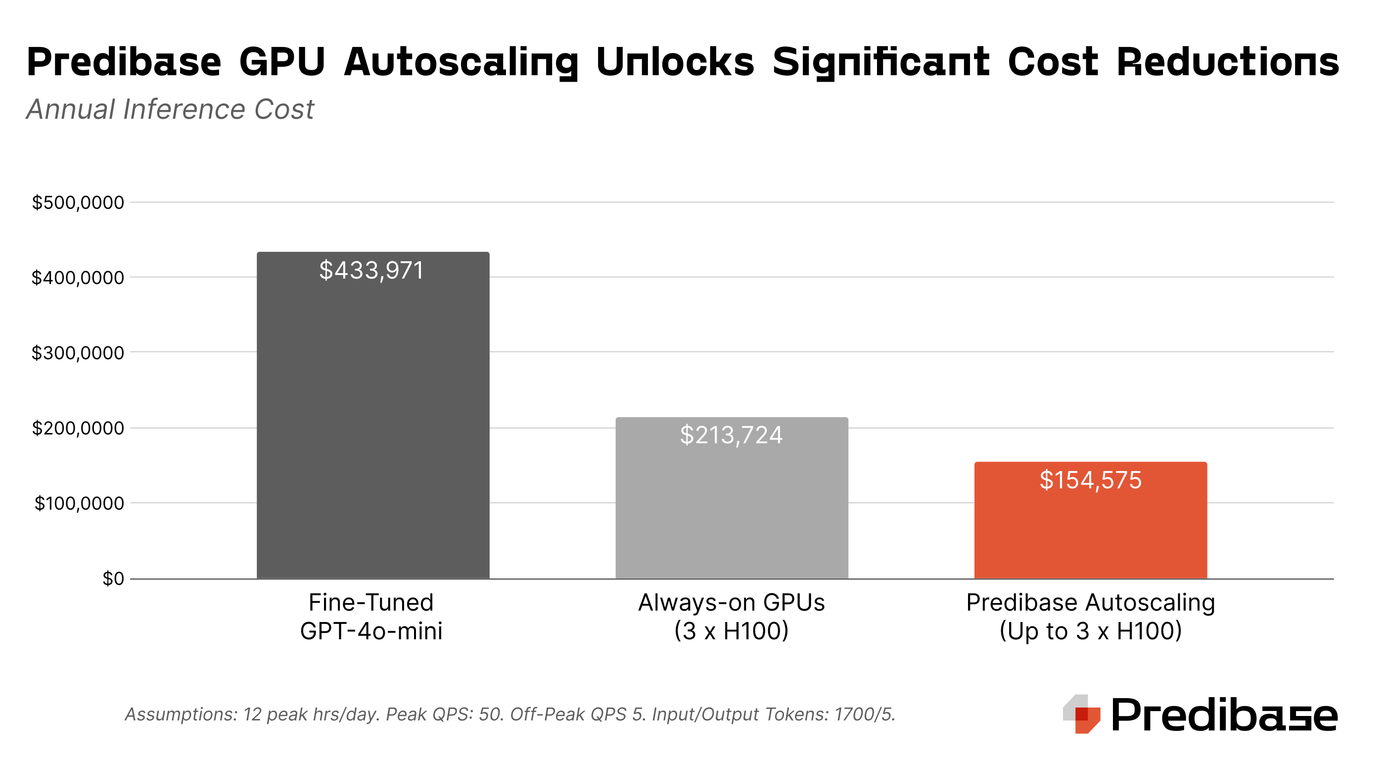 In addition to optimizing performance, GPU autoscaling significantly reduces deployment costs. Unlike traditional "always-on" GPU deployments, which incur continuous expenses regardless of actual usage, autoscaling ensures resources are allocated only when needed. In the example above, a standard always-on deployment for an enterprise workload would cost over $213,000 per year, while an autoscaling deployment reduces that to less than $155,000 annually—offering a savings of nearly 30%. (It’s important to note that both deployment configurations cost less than half as much as using fine-tuned GPT-4o-mini.) By dynamically adjusting GPU resources based on real-time demand, enterprises can achieve high performance without the burden of overpaying for idle infrastructure, making AI deployments far more cost-effective.